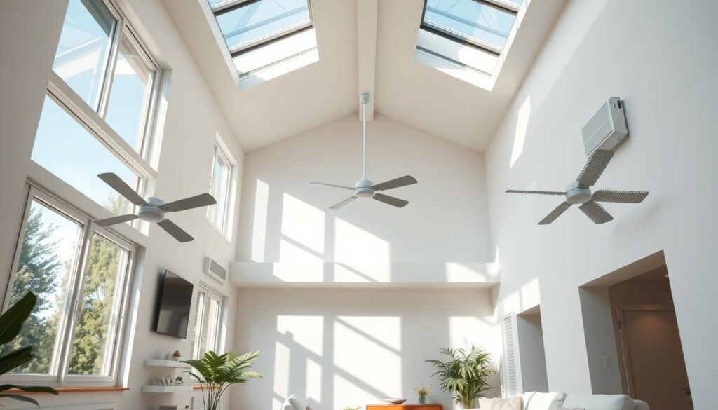 Instalar ventiladores de teto é uma boa ideia. Eles movimentam o ar constantemente, ótimo para o verão. Isso ajuda a espalhar o ar fresco pelo ambiente.