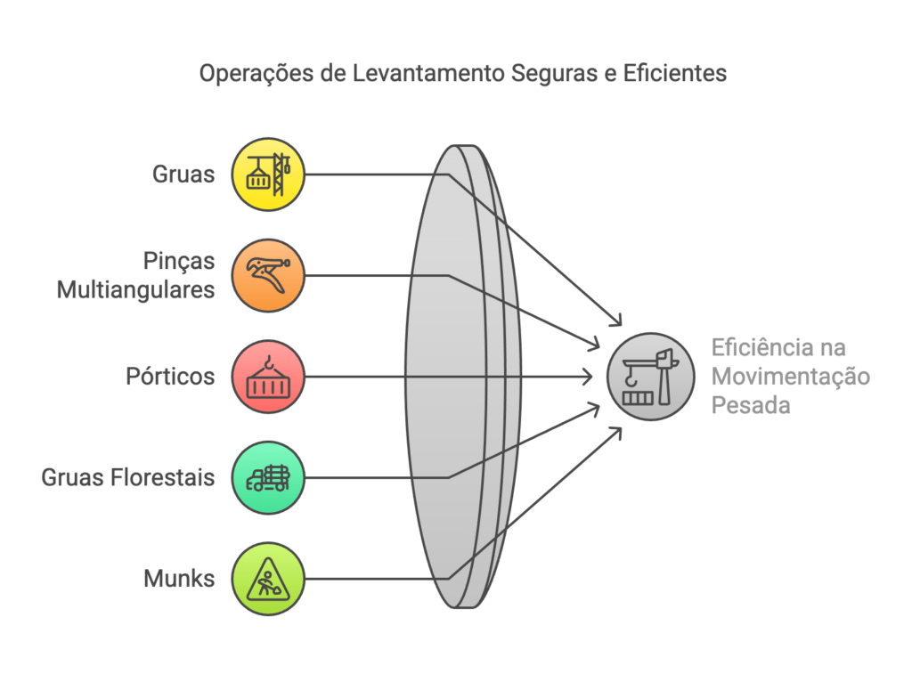 Os guindastes são fundamentais para a movimentação de cargas pesadas e volumosas. Diferentes tipos de guindastes incluem: – Grua: Versátil para movimentos verticais e horizontais. – Pinça ou Multiangular: Manipula materiais com formatos irregulares. – Pórticos: Ideais para movimentação em portos. – Grua Florestal: Usada na indústria madeireira. – Munk: Montado em caminhões, utilizado em construções e outros ambientes externos.