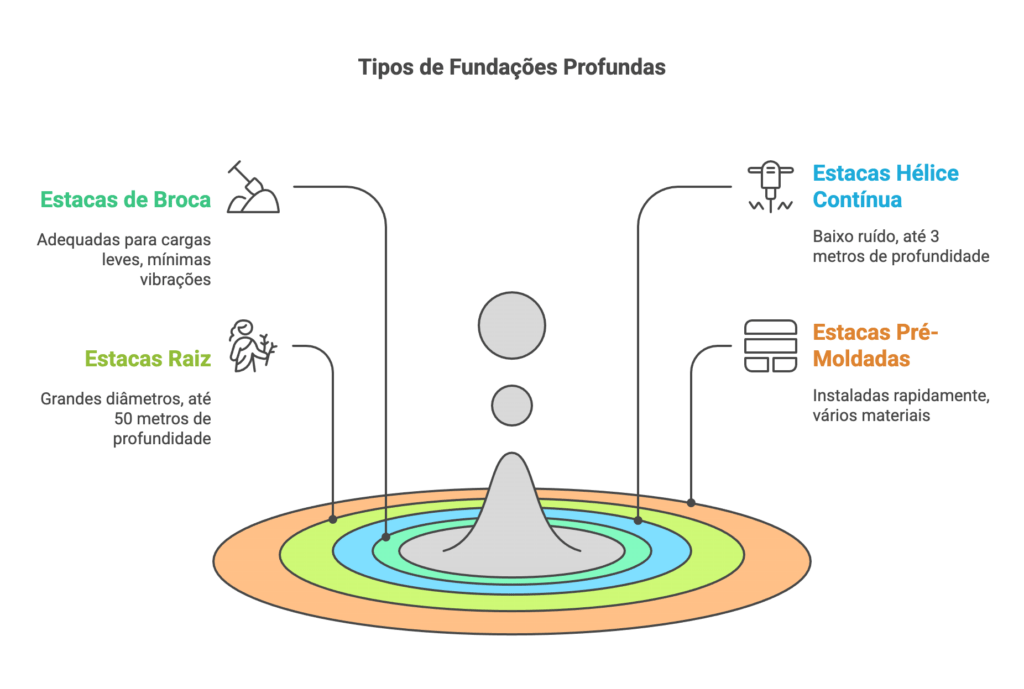 Quando o solo firme está mais de 3 metros para baixo, precisamos das fundações profundas. Tem estacas de vários materiais, como madeira e concreto. E os tubulões ajudam em locais que podem alagar. É muito importante conhecer bem cada tipo para a obra ser segura e eficiente.