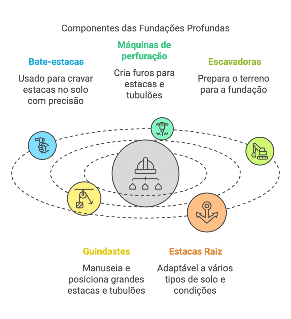 Escolher o maquinário para fundações profundas certo significa olhar para o solo e o que o projeto precisa. Alguns equipamentos essenciais são: