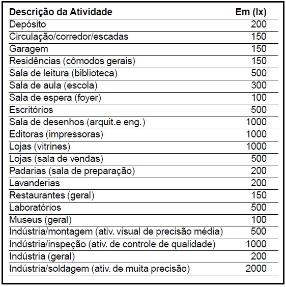 Segundo a Norma 8995 da ABNT, cada tipo de ambiente de trabalho interno deve ter uma iluminação adequada considerando quantidade de luz e qualidade. Os níveis de iluminação variam de acordo com a atividade realizada:
