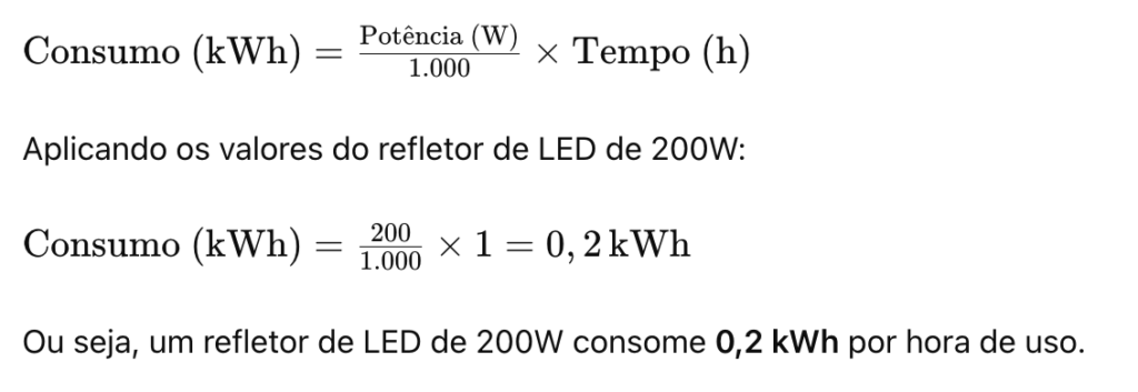 Para calcular o consumo de energia de um refletor de LED de 200W por hora, utilizamos a fórmula: