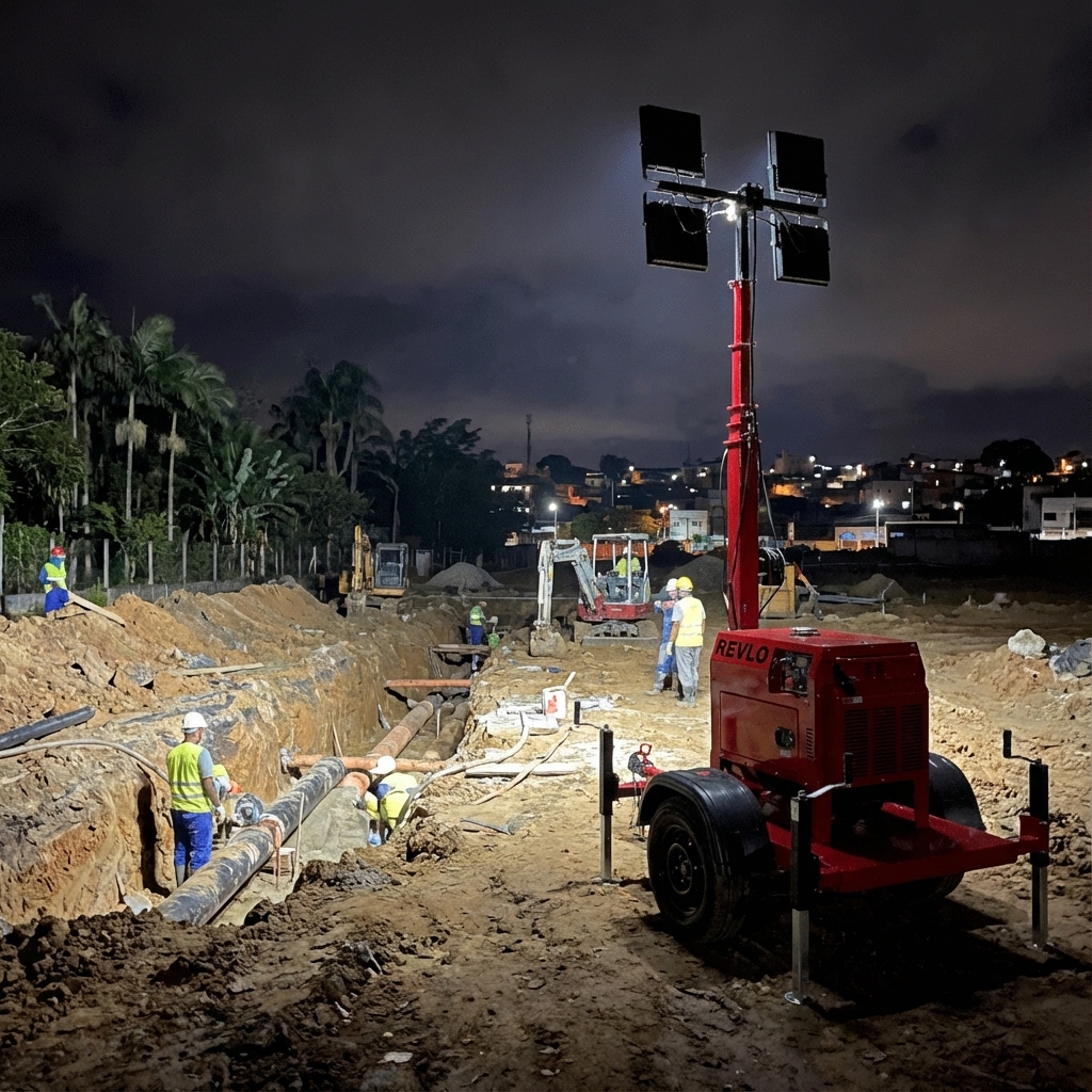 Na instalação de torre de iluminação para obras de saneamento, a falta de energia elétrica é um grande obstáculo. Instalar infraestrutura temporária pode ser muito caro e atrasar os prazos.